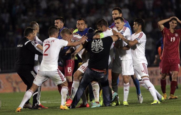 Nakon što se iznad terena pojavila zastava sa obeležijima tzv velike Albanije, a fudbaler Srbije Stefan Mitrović počeo da je skida, njemu su prišla dvojica igrača albanske reprezentacije sa namerom da ga spreče