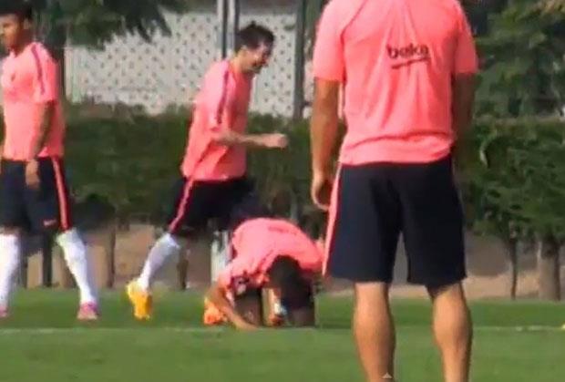 BARSELONA - Fudbaler Barselone Lionel Mesi pogodio je loptom u međunožje saigrača Nejmara na treningu katalonskog kluba.