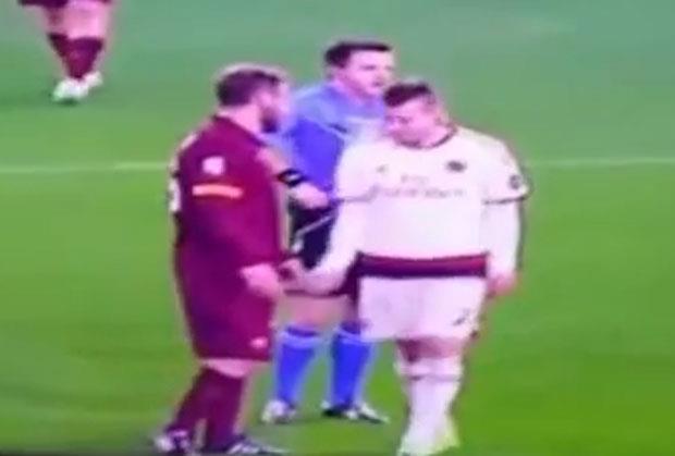 RIM - Fudbaler Milana Žeremi Menez uhvatio je za međunožje igrača Rome Danijelea de Rosija na meču 16. kola italijanske Serije A.