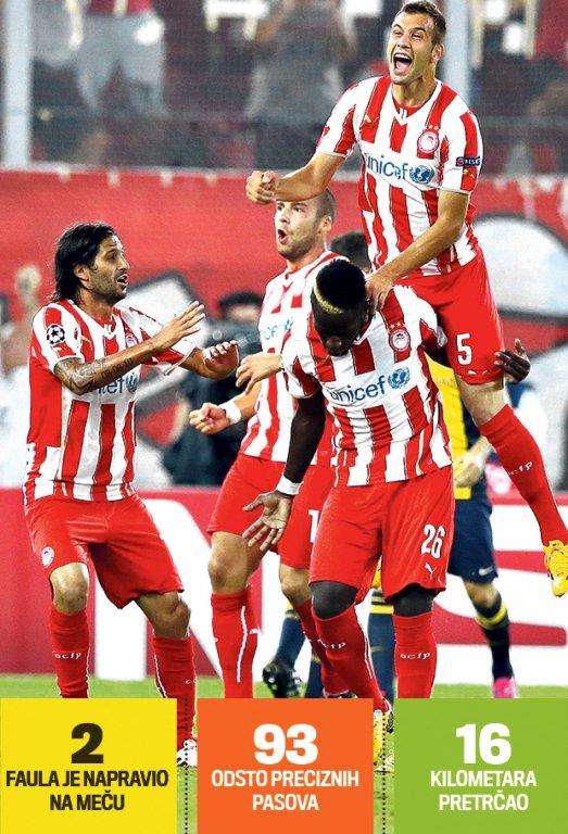 Prva dva gola za Olimpijakos postigao je Horhe Benitez u trećem i i 26. minutu. Revanš utakmica osmine finala igra se za sedam dana u Pireju.