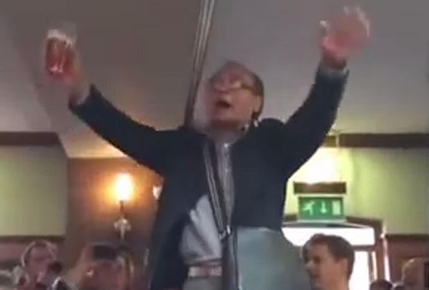 Kinez se popeo na sto i zajedno je pevao sa ostalim navijačima Junajteda, koji su u rukama imali čase sa pivom.
