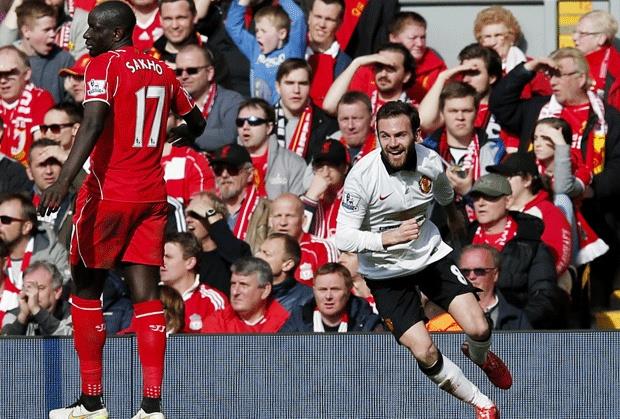 Fudbaler Mančester junajteda Huan Mata postigao je oba gola u pobedi njegovog tima u derbiju 30. kola Premijer lige protiv Liverpula na Enfildu - 2:1 (1:0).