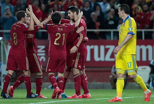 Aktuelni šampion Evrope Španija namučila se protiv Ukrajine u Sevilji. Ipak, "crvena furija" je pobedila golom Alvara Morate u 28. minutu i pobegla večerašnjem rivalu na tabeli Grupe C. Španija posle četiri meča ima 12 bodova, a Ukrajina je ostala na devet. Slovačka i dalje ima stoprocentan učinak (15 bodova) pošto je rutinski savladala Luksemburg -. 3:0. U istoj grupi Belorusija je kao gost pobedila Makedoniju 2:1, ali to su reprezentacije koje nemaju šanse da se umešaju u borbu za odlazak u Francusku.