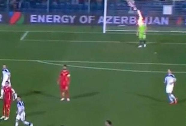 Snimak je sličan onom prvobitnom koji se mogao naći na društvenim mrežama, ali se sada još bolje vidi kako je baklja pogodila ruskog golmana