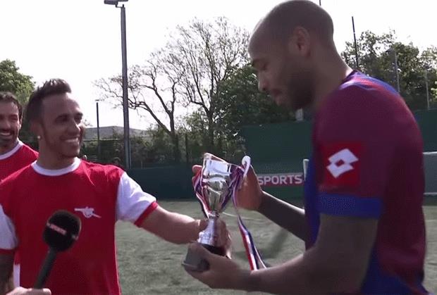 Šampion Formule 1 Luis Hamilton odigrao je partiju malog fudbala za Arsenal, klub za koji navija. Za "tobdžije" su još igrali i veterani Robert Pires, Sol Kempbel i Rej Parlor, a rivali su im bili analitičari "Skaj Sportsa", ali pojačani takođe legendarnim igračima londonskog kluba Tjerijem Anrijem i Džejmijem Karagerom.