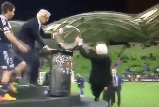 Ipak, vest o trijumfu ekipe iz Melburna nije bila glavna sa te utakmice. Glavni junak večeri bio je prvi čovek australijskog fudbala, 84-godišnji milijarder Frenk Levi. On je pao sa bine na kojoj je trebalo da uruči šampionski pehar igračima Melburna, i to unazad na glavu!