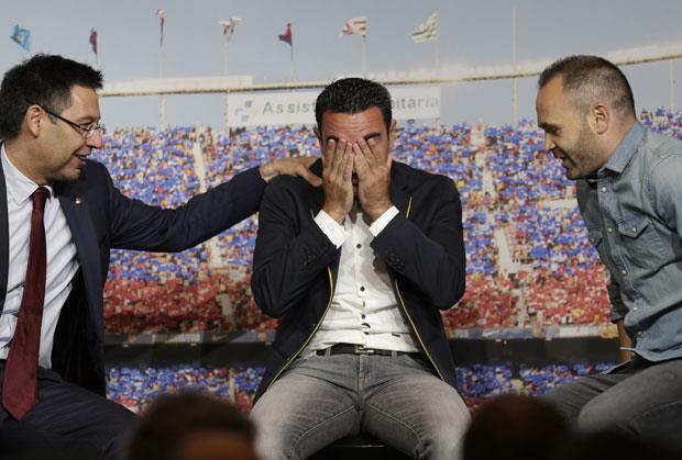 Barselona je odlučila da napravi oproštaj Ćaviju, a fudbaler nije mogao da sakrije suze. Pored Ćavija bili su predsednik Barselone Hoze Marija Bartomeu i igrač Andres Inijesta.