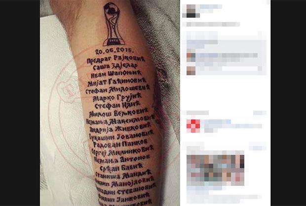 Nepoznati navijač Srbije nije gubio vreme posle odsviranog kraja finalnog meča na Novom Zelandu, već je pronašao način kako da ovekoveči istorijski dan za srpski fudbal. On je na podlaktici istetovirao kompletan tim svetskih prvaka, uz FIFA pehar i datum kad je osvojen.