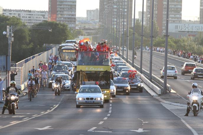 "Orliće" je u otvorenom autobusu od Stare Pazove do Skupštine grada Beograda pozdravilo više od 100.000 građana. Navijači su uz pesme, baklje, zastave i transparente dočekali omladinsku fudbalsku reprezentaciju Srbije.