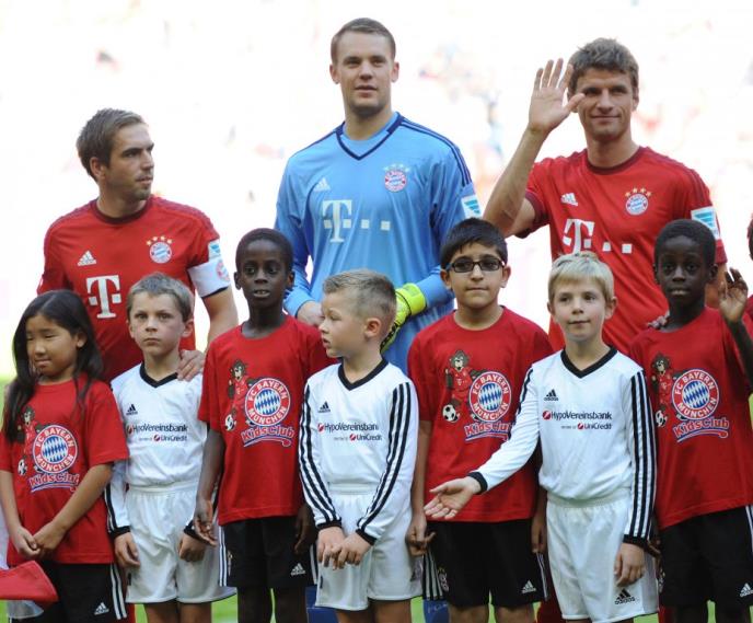 Fudbaleri su jednom rukom držali izbegličko dete, a drugom nemačko, kao simbol integracije izbeglica, saopšteno je na sajtu kluba.