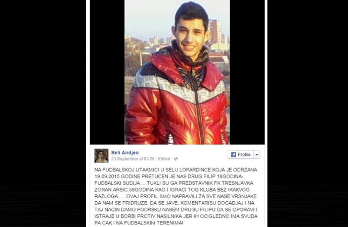 VRANJE - Povodom prebijanja fudbalskog sudije Filipa Nikolića (18), na utakmici u selu Lopardince, njegovi drugovi pokrenuli su FB grupu “Beli anđeo” i akciju “Drug nije meta - stop nasilju”.