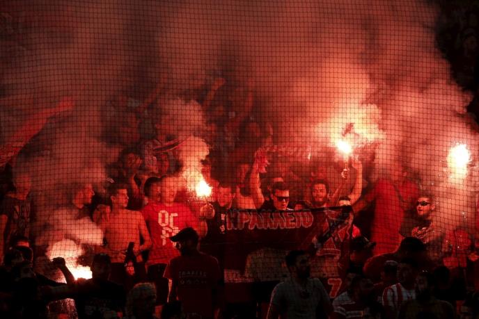 Navijači Olimpijakosa, potpomognuti sa nekoliko stotina "Delija" koji su specijalno za utakmicu protiv zagrebačkog Dinama stigli iz Srbije, priredili su spektakularnu koreografiju.