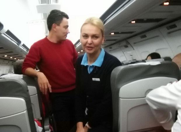 Kapetan Stevan Ignjatović pozdravio je stjuardesu Tanju Aksentijević kojoj je let sa fubdalerima Crvene zvezde bio poslednji posle 30 godina karijere, jer sutra odlazi u penziju.