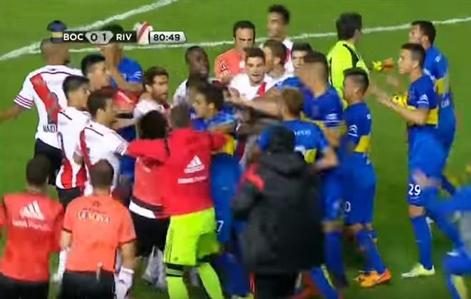 Potpuni haos nastao je u 80. minutu kada se Karlos Tevez uneo u lice Džonatanu Majdani. Igrač Rivera je zatim cimnuo glavu ka Tevezu, koji se srušio kao pokošen. Majdana je dobio crveni karton, a na terenu je nastao opšti haos.