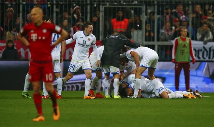 Bajern je danas potpuno dominirao u utakmici 24. kola, ali nije uspevao da iskoristi svoje šanse, a golman Majnca Loris Karijus nekoliko puta je spasavao svoj tim. Gosti su svoja dva gola postigli iz ukupno tri šuta u okvir gola, a posed lopte im je bio manji od 30 odsto, ali su na kraju uspeli da naprave veliko iznenađenje. Golove za Majnc postigli su Hairo Samperio u 26. i Džon Kordoba u 86. minutu, dok je strelac za Bajern bio Arjen Roben u 64. minutu.