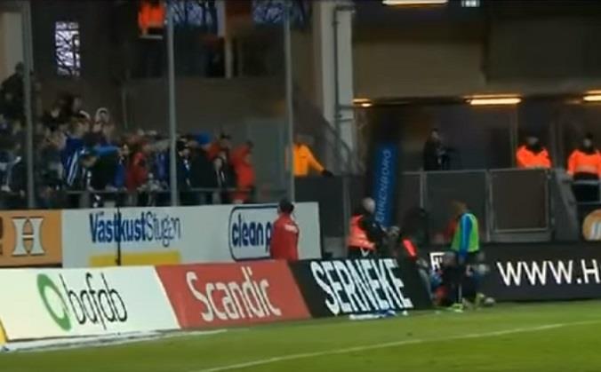 Meč između Geteborga i Malme prekinut je u 77. minutu. Tada su navijači domaćeg tima topovskim udarom pogodili gostujućeg igrača Tobijasa Sanu dok se zagrevao, a on im nije ostao dužan. Uzeo je korner zastavicu i uzvratio.