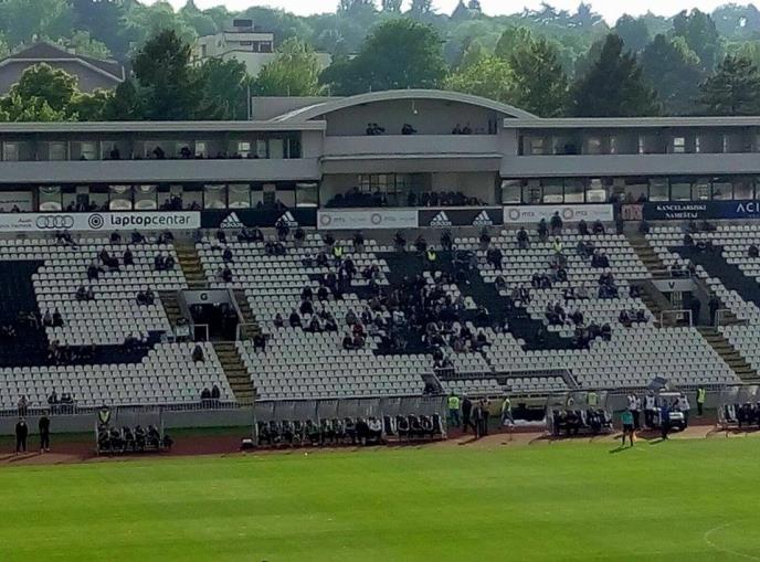 Ispod nje su stajali Pripadnici Žandarmerije, a u delu tribinr sa koje su nedavno navijači bacali jaja na članove uprave kluba, nije bilo publike