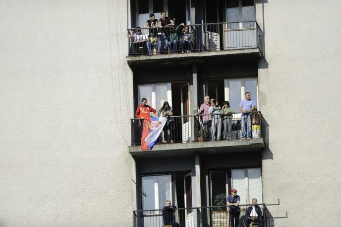 Oni koji nisu uspeli da uđu na stadion, a žive u blizini meč su posmatrali sa terasa, pevajući i mašući zastavama.