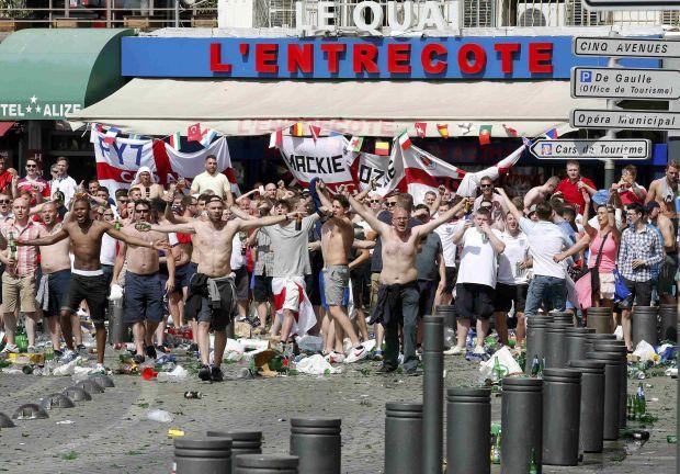 Francuska policija je u Marseju uhapsila šest osoba i morala je da upotrebi vodene topove da bi rasterala navijače fudbalske reprezentacije Engleske koji su se sukobili sa suparnicima iz drugih zemalja i sa policajcima.