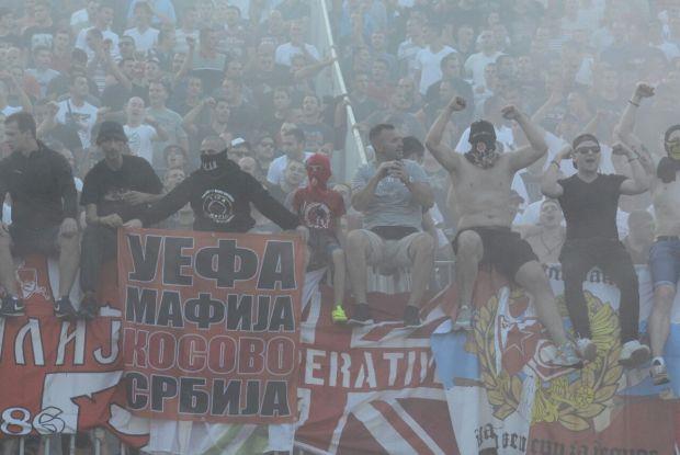 Navijači Crvene zvezde su na derbi meču sa Partizanom razvili transparent na kome je pisalo: UEFA mafija, Kosovo Srbija.