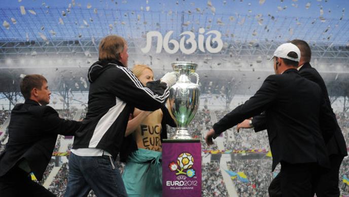 LAVOV- Fudbalsko prvenstvio Evrope nije još ni počelo, a organizatori pogotovo oni u Ukrajini ne mogu da spavaju od problema. Uz već poznate, u poslednje vreme od kada je u njihiovu zemlju stigaao pehar pobednika, glavobolju im zadaju " napadi" feministkinja, koje koriste svaku priliku da pokažu prezir prema fudbalskom Šampionatu Evrope EURO 2012.. Prema naavici one pehar pobednika napadaju golim grudima