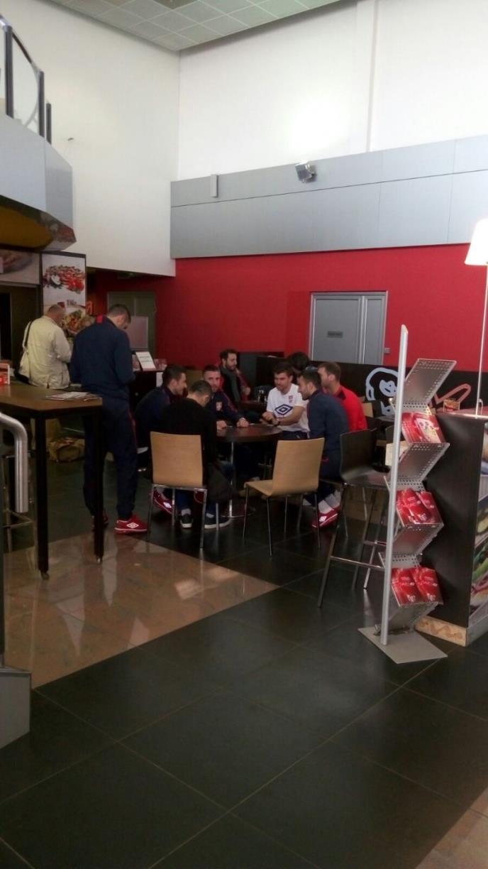 Fudbaleri, sa kojima su i pred put bili glumci Vojin Ćetković i Nikola Đuričko su vreme koje su proveli čekajuči ukrcavanje proveli u opuštenom razgovoru, nasmejani, što se vidi i po fotografijama.