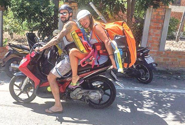 Zaljubljeni par na motoru istražuje predele ove azijske zemlje i po svemu sudeći kampuje, jer su im sve stvari spakovane u planinarske rančeve.
