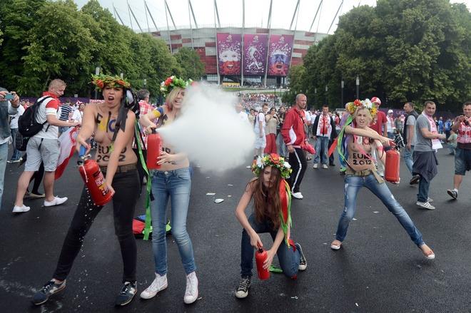 One su članice grupe Femen koja se protivi Evropskom prvenstvu u Poljskoj i Ukrajini jer strahuju da će tokom turnira prostitucija biti rasprostanjenija nego inače. Portparol policije Maciej Karčinski rekao je da su Ukrajinke privedene na saslušanje.