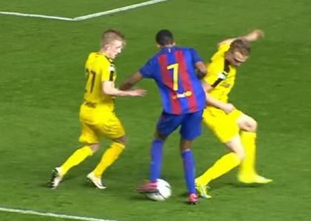 Mladi fudbaler Barselone Đordi Mbula postigao je predivan gol na utakmici protiv Borusije Dortmund u osmini finala juniorske Lige šampiona.
