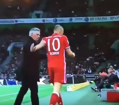 Fudbaler Bajerna Arjen Roben naljutio se na trenera Bavara Karla Anćelotija zbog izmene na meču protiv Borusije iz Menhengladbaha u meču 25. kola Bundeslige.