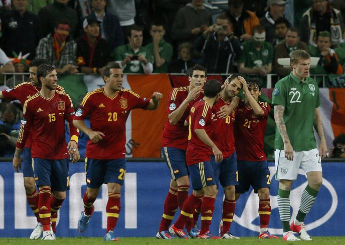 GDANJSK - Fudbalska reprezentacija Španije pobedila je večeras u Gdanjsku selekciju Irske sa 4:0 u drugom kolu Grupe C Evropskog prvenstva i tako došla na prvo mesto tabele. Golove su postigli Fernando Tores u 4. i 70. minutu, zatim David Silva u 49. i Sesk Fabregas u 83. minutu.