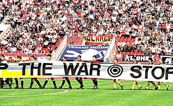 Jedni i drugi su pred 15.000 navijača, dok je na snazi bila vazdušna opasnost, istrčali sa simbolom mete na dresovima uz transparent sa porukom: "NATO, prekini rat, prekini bombardovanje".