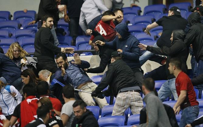 Naime, Turci su sa gronjeg nivoa tribina bakljama gađali domaće navijače na donjem nivou, a onda su krenuli u obračun. Nastao je opšti haos. Tuča je bila jeziva, a mnogi su se, bežeći od frke, sjurili na teren. Nastao je stampedo...