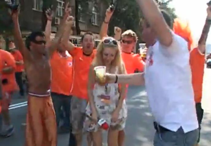 Evo šta se dešava kada voditeljka u mini-suknji pokuša da snimi najavu za emisiju, takozvani stend-ap! Ukrajinska reporterka uletela je u osinjak raspoloženoh holandskih navijača. Naravno, specijalnost fanova je ometanje reporterki, mahanje pred kamerama, pevanje... Jedan od njih čak je uputio bračnu ponudu... Ipak, ona je na kraju uspela da uradi najave.a