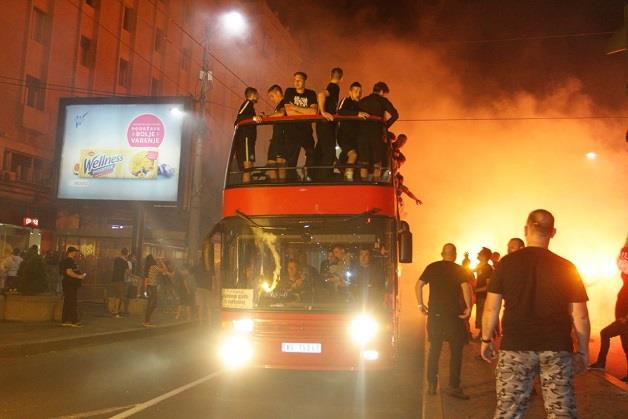 Partizanove igrače na Terazijama je dočekao veliki vatromet, a navijači su uz to napravili i bakljadu.