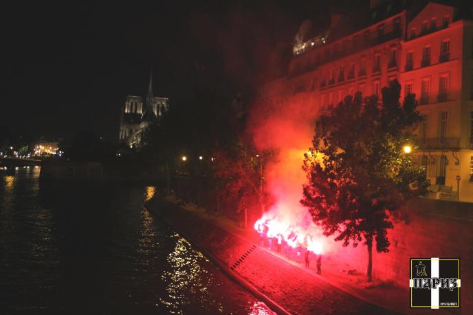 Grobari iz Pariza, koji imaju ozbiljnu organizovanu navijačku grupu, obeležili su trofeje bakljadom u blizini katedrale Notr Dam.