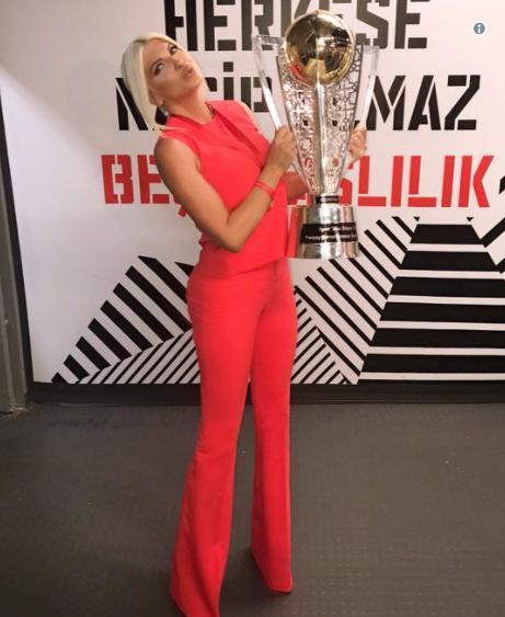 Supruga fudbalera Bešiktaša Duška Tošića, Jelena Karleuša, slikala se sa šampionskim peharom pošto je klub iz Istanbula osvojio titulu u Turskoj.