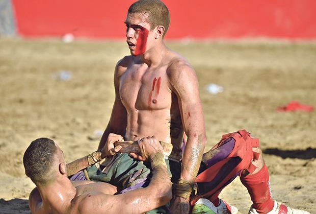 Polufinalni mečevi ovog nekoliko vekova starog brutalnog nadmetanja odigrani su prethodnog vikenda na tradicionalnom mestu, Trgu Santa Kroče u Firenci. Nadmetale su se četiri ekipe od po 27 snažnih i odvažnih igrača - Santa Kroče (plavi), Santa Marija Novela (crveni), Santo spirito (beli) i San Đovani (zeleni). Moderna verzija kalča fjorentina dozvoljava rvanje, davljenje, udaranje u butine i telo, ali ne i u glavu. To, naravno, nije sprečilo povrede igrača, a neki su bukvalno bili krvavi.