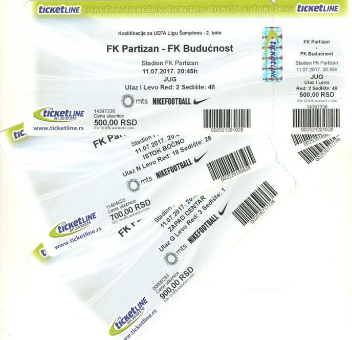 Na blagajnama stadiona Partizana prodaja će početi u ponedeljak 10.7.2017. u radnom vremenu od 10.00 do 18.00 časova. Prodaja na dan utakmice odvijaće se samo na blagajnama stadiona Partizana od 10.00 časova pa do početka utakmice.