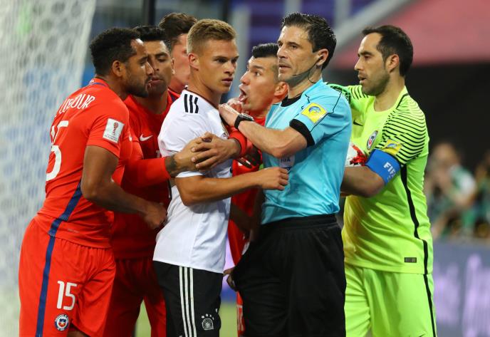 Fudbalske reprezentacije Čilea i Nemačke igraju finale Kupa konfederacija na stadionu "Krestovski" u Sankt Peterburgu, a pravdu deli srpski arbitar Milorad Mažić.