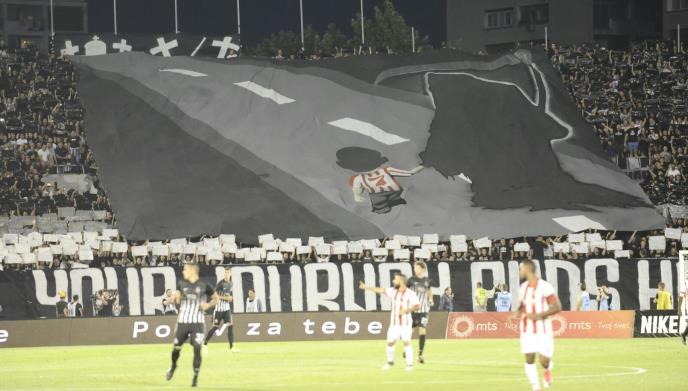 Na sve strane moglo se videti samo crno-belo, a transparentom na južnoj tribini poslata je poruka gostima iz Pireja: