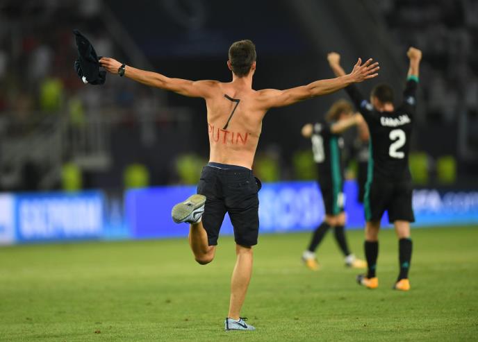 U jednom trenutku golišavi navijač je uspeo da istrči na teren. Na leđima mu je ispod broja sedam pisalo "Putin".