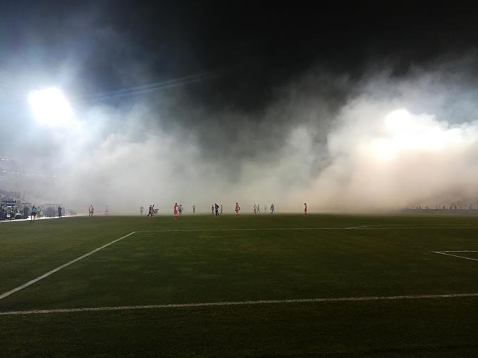 Kiša nije sprečila navijače Zvezde da bakljama pozdrave svoje ljubimce na terenu, a sa tribine se orila i pesma.