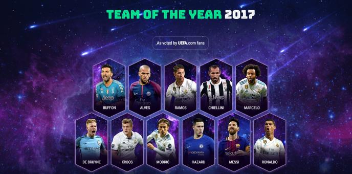 Evropska fudbalska unija (UEFA) tradicionalno je izabrala najbolji tim za 2017. godinu glasovima na zvaničnom internet sajtu u kojem nema velikih iznenađenja pošto dominiraju fudbaleri španskog i evropskog prvaka Real Madrida.