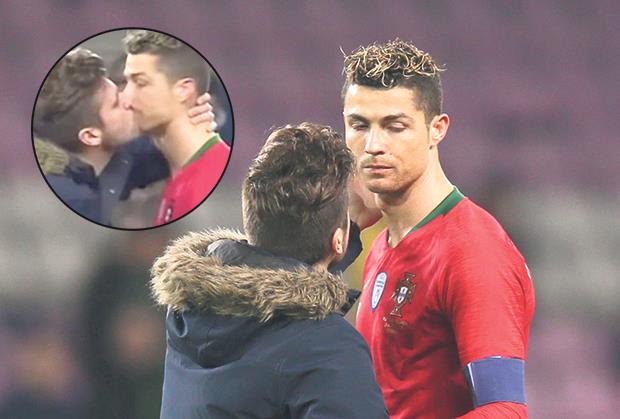 Tokom prijateljskog meča Portugal - Holandija (0:3) odigranog u Ženevi, Kristijano Ronaldo bio je meta dvojice muškaraca, koji su uleteli u teren kako bi se jedan od njih slikao s popularnim fudbalerom, a drugi ga poljubio u usta!
