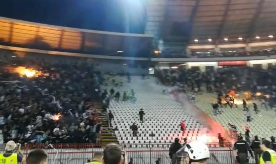Ni 157. susret večitih rivala nije mogao da prođe mirno, te su tokom drugog poluvremena navijači napravili pravi haos na tribinama, te je derbi prekinut na nekoliko minuta.