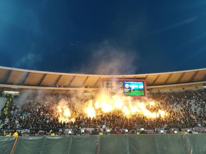 Navijači Partizana su na startu drugog poluvremena napali pripadnike žandarmerije topovskim udarima.