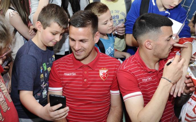 Još jedan lep prizor, koji je postao uobičajen kada Crvena zvezda gostuje u školama, puna sala đaka, bio je prisutan i danas. Radonjić i Gobeljić su u školskoj klupi uživali u razgovoru i druženju sa mališanima. Ni tu nisu izostale fotografije i autogrami. Mnogo smeha odzvanjalo je fiskulturnom salom, a i igrači, kao i đaci podjednako su uživali.