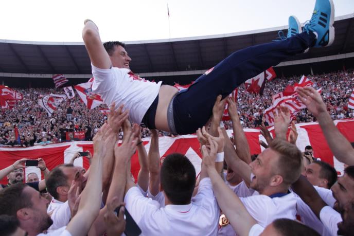 Na današnjoj proslavi titule na "Marakani" fudbaleri Zvezde su podigli Milojevića i bacali ga u vis...