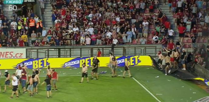 Pristalice Sparte su desetak minuta pre kraja uletele na teren stadiona u Prafu. One su proskočile ogradu iza gola i krenule ka fudbalerima tima za koji navijaju.